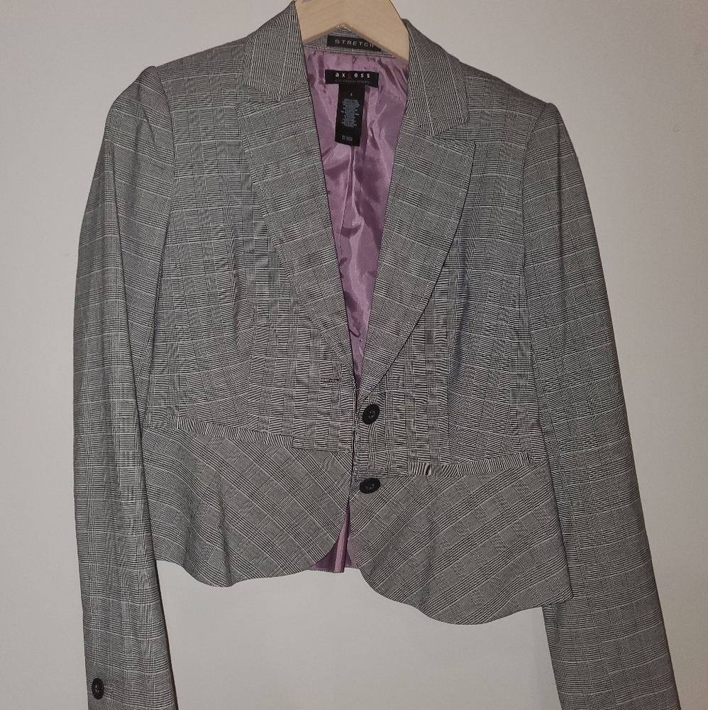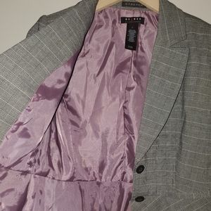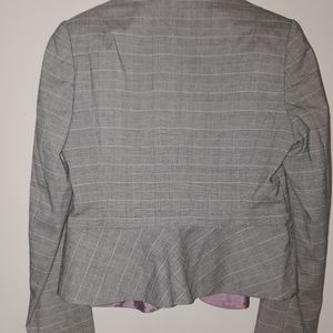 Grey patterned Blazer with ruffle detail and lavender interior.