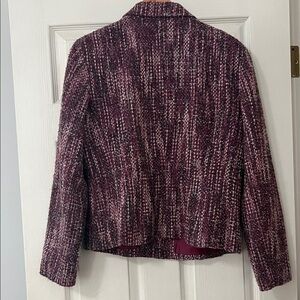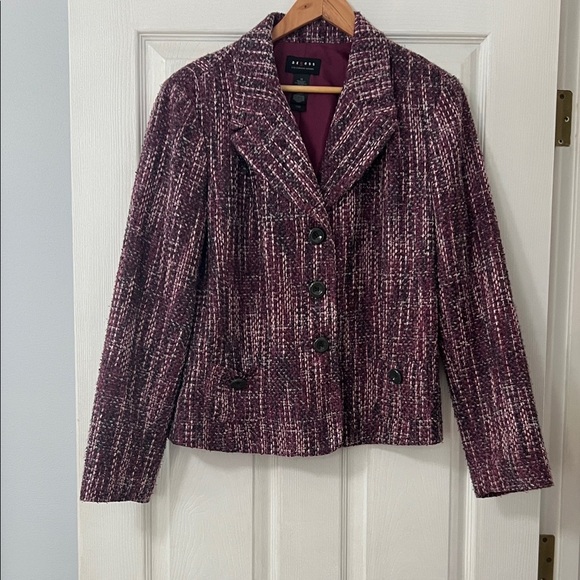 Stylish burgundy tweed blazer. Features button closure. Perfect for formal occasions.