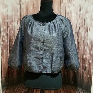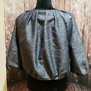 Jacket has one button and is structured with tucks around the neckline, waist and sleeves.