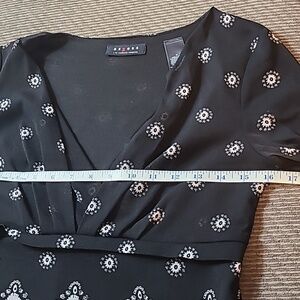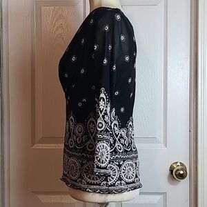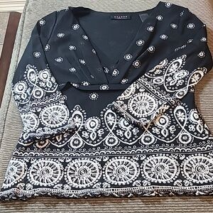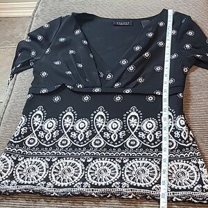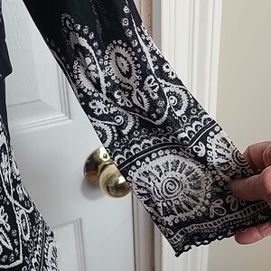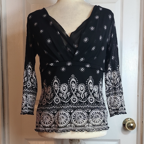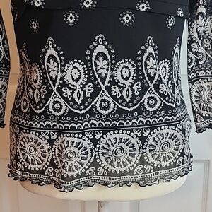 Long Sleeve, V Neckline, Sleeves and Hemline Have Lettuce Edges, Lightweight Mesh Like Material, Stretchy, Lined, Black With White Print, Size Medium.