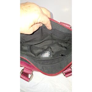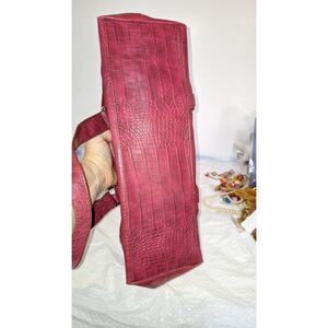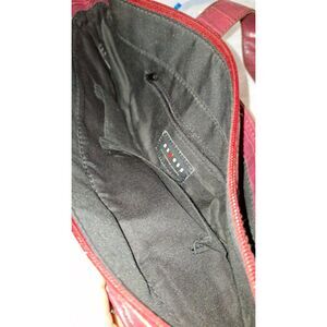 This Axcess purse has a great look. it is a brand by Liz Claiborne. It has a faux alligator texture in a pinkish red color. It is in nice pre-owned condition. This bag has one large pocket with a zipper closure that has a zippered pocket on the inside along with two media pockets. There is also another larger pocket that does not have a closure. It is about 17" long and 7" high.