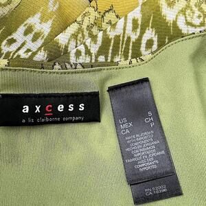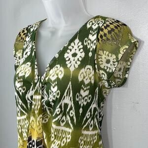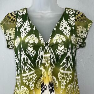 Axcess greens, yellow, black, and white mesh ikat print babydoll top in Excellent pre-owned condition!