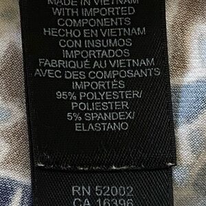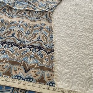 Elegant faux wrap dress with intricate blue and brown design. Stretchy and comfortable. Ideal for any occasion. Excellent preowned condition with no flaws.