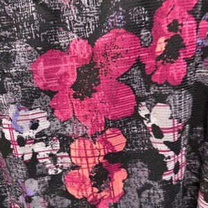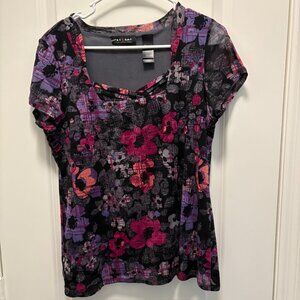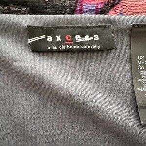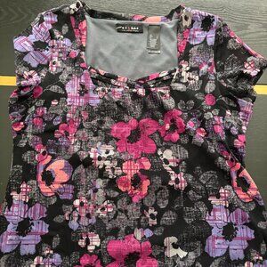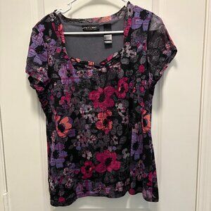Axcess by Liz Claiborne Floral Abstract Print Short Sleeve Top . Size large. Excellent pre-owned condition—no stains, holes, or fading. Abstract floral print in pink, purple, and black with a squarish neckline accented by a subtle crisscross detail. Lightweight stretch fabric. 100% polyester. Approx. measurements: pit to pit 20", shoulder to bottom 24.5".