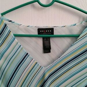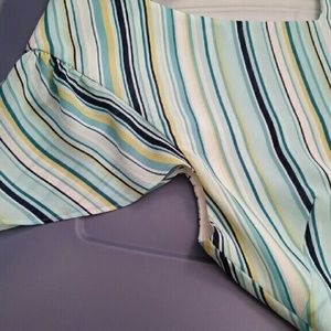 Dresses up for office wear or dresses down for daily wear. Super comfy, flowey material. Fully lined throughout the body of the shirt. Pretty shades of aqua, teal, lime & navy blue stripes. 100% Polyester.