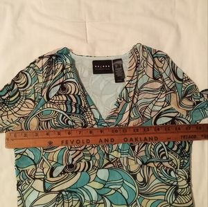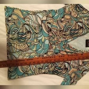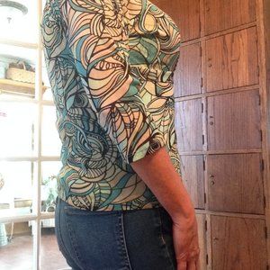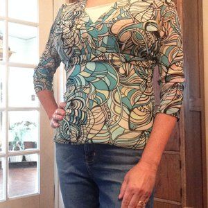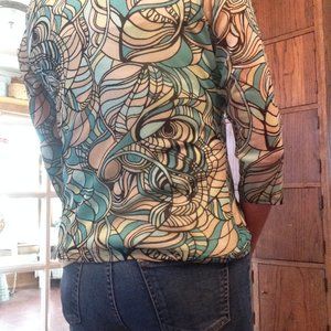 Fitted and unique top with 3/4 sleeves and criss-cross front in great shape. Nice transition piece between seasons.