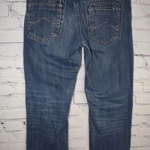 Dark wash straight leg jeans with color distressing.
