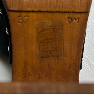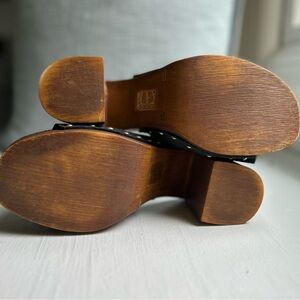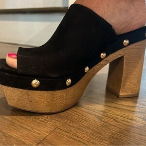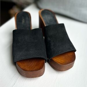 Experience the perfect blend of vintage charm and modern style with these Axel Salto mules. Featuring a black suede upper and a warm brown wooden platform sole, these shoes are adorned with gold studded detailing for a touch of elegance. The open back slip-on design and chunky heel ensure both comfort and a striking silhouette.