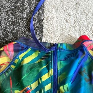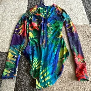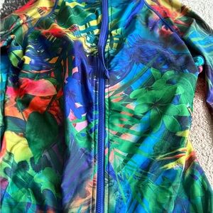 Bright and vibrant women’s one piece swimsuit featuring a tropical design. Perfect for fun in the sun. Zipper back - long sleeve