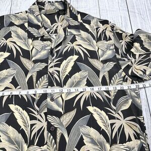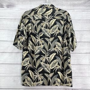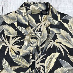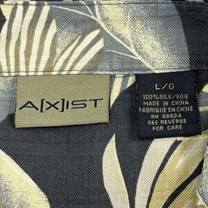 This is a men's short-sleeved button-up shirt made by Axist. It is made of 100% silk and is a regular fit size large. The shirt is black with a green Hawaiian print theme.