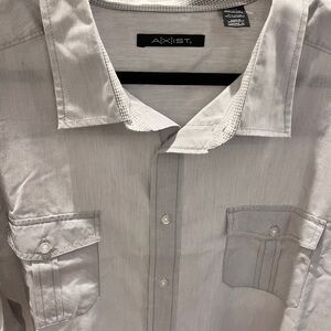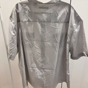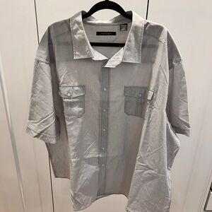 Stylish light gray shirt with button-down front. Features short sleeves and two chest pockets. Ideal for casual outings.