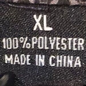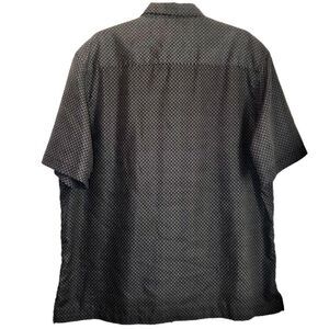 This short sleeve shirt has a small scale geometric print in black and grey. It has a casual straight hemline with side vents. It is made of a soft polyester that has good body. In excellent used condition.