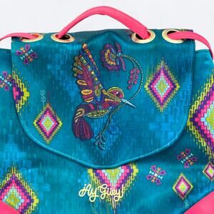 Women's Bright Colorful Iridescent Hummingbird Design Cleo Convertible Backpack/Purse with Vegan Leather Details from Ay Güey! Mexico in Turquoise, Hot Pink