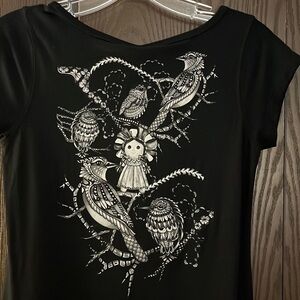Ay Güey black capped sleeved shirt with bird/doll design. Size S. NWT