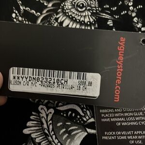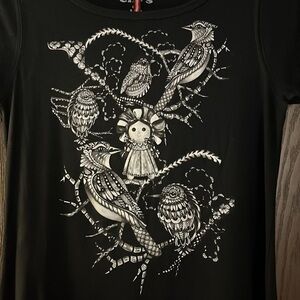 Ay Güey black, capped sleeved top. Decorated with birds and a doll in the middle in gray and white. Design on the back also. Soft fabric. NWT. price tag says $800.