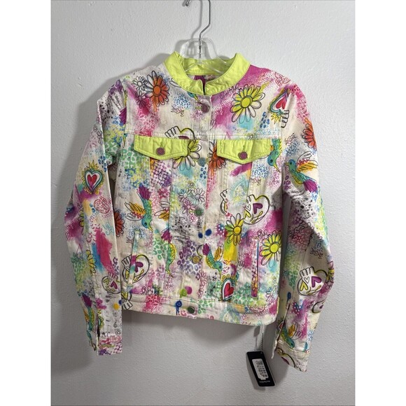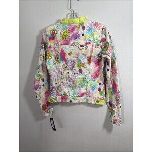 This Ay Guey jacket is designed for women in size XS, featuring a collared neckline and button closure. Made from denim fabric with a colorful floral print, this button-up jacket has long sleeves and casual sleeve type. It is a basic style with accents of buttons, suitable for various occasions such as travel, weddings, parties, casual wear, formal events, workwear, or business settings. The jacket is adorned with an Alice in Wonderland character theme and has a comfortable regular fit, perfect for all seasons.