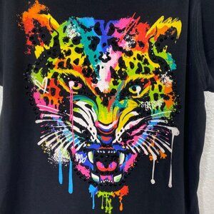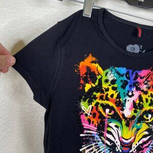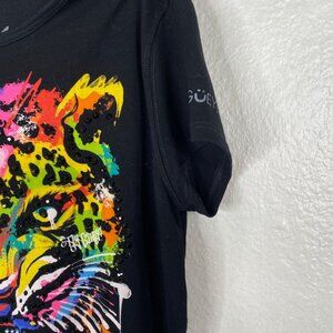 Great Pre-owned Condition Ay Guey Women's Top Black Sz S Baby Tee Jaguar Graphic Rhinestones Colorful