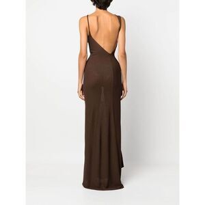 macramé-detail maxi dress from Aya Muse featuring chocolate brown, stretch-design, one-shoulder, macramé detailing, low back and floor-length.