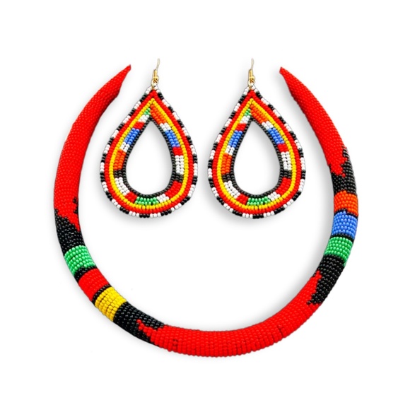Zulu Necklace. Maasai Red and Multi Color Bead Wrapped Tribal Necklace Set with Large Teardrop Earrings. Earrings Measure 3.25 inches long