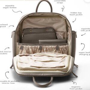 ➵ Vegan leather. Comes with stroller straps and the insulated/removable bottle/snack pouch (No changing pad, wet bag, or snack bag). Inner liner is removable and washable. Can be worn as a cross body or a backpack.