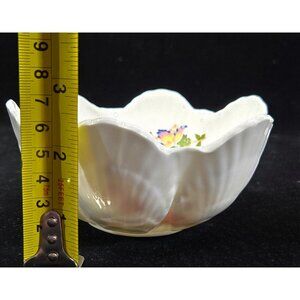 This finely crafted Aynsley bone china bowl features a delicate scalloped edge with a vibrant floral and butterfly motif. A timeless piece for collectors or decor, its Cottage Garden pattern reflects English craftsmanship and artistry. 5.5"