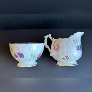 ~Both the creamer and sugar bowl are beautifully designed with a multicolor all-over pattern of fruits , accented by a sprinkling of dainty florals.