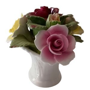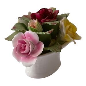 Aynsley Porcelain Flower Basket June Rose Hand Molded England Vintage TINY CHIP. Condition is pre-owned and vintage mid Century Modern. THERE IS A MISSING TIP OF ONE LEAF. No other chips or chips.... Amazingly. Measures about 3" x 4". Please see all photos for detailed condition.