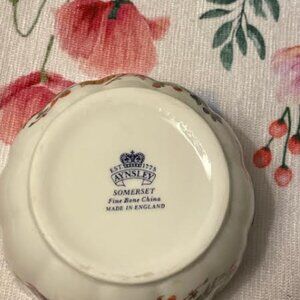A beautiful delicate Bone China Trinket Bowl with lid the "Cottage Garden" design by Somerset Aynsley. It features a pretty floral pattern and butterfly lid topper with a glossy finish and gold trim.