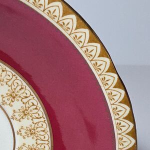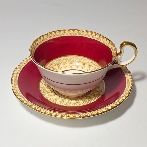 Vintage Aynsley teacup and saucer. Burgandy background with gold details. Bone china made in England. Crazing on cup and sauce due to age.