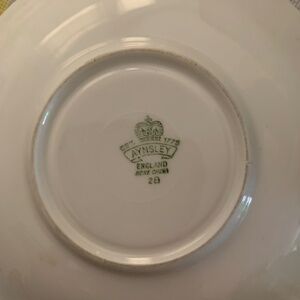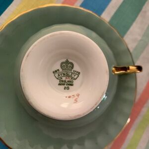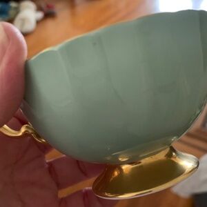 Vintage English bone china teacup and matching saucer. Sea foam green with gold foot and painted fruit inside the cup.