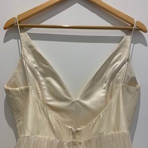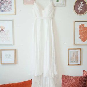 It has some alterations: bust was altered down and cups were added. A single bustle was added as well, and the length was altered. I'm 5'5 and had short (1.5" heels).