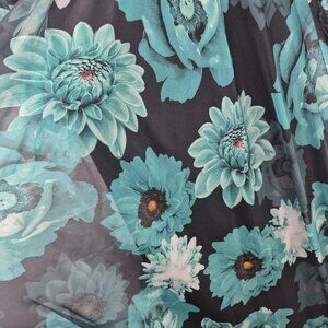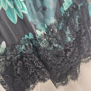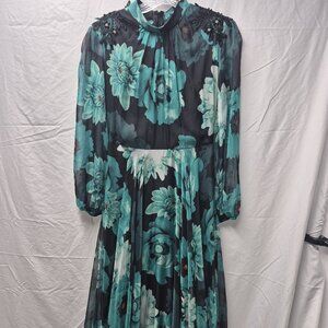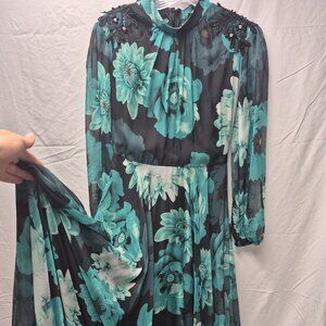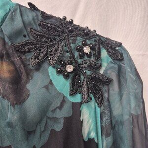 Ayyka Green/Black Floral Gown size 38 with lace and jeweled details, long sleeve, collared, maxi-long dress 64" from shoulder to bottom hem 14" from shoulder to waistline 22" from shoulder to cuff 16" from armpit to armpit
