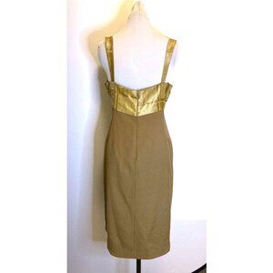Azadeh olive diagonal twill dress and jacket suit with watercolor silk collar, cuffs, and bows and dress bodice. Dress empire waist bodice has boning for structure and pleating at the bust to give shape. Jacket has wide portrait neckline and wide lapels. Very wearable size. Made in USA