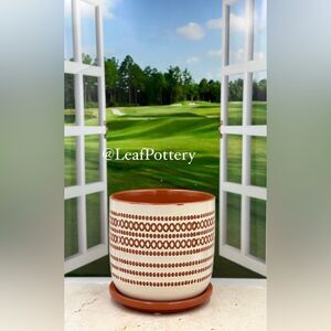 Dimensions: 6”H x 6”W, Opening 5.5”,weight 3lbs 0.7oz, Drainage hole, saucer attached to the planter, Materials: Ceramic, Type: Barrel Planter, Color: Orange & White, Made in China , Perfect for Indoor/Outdoor gardening, Don’t forget to dress up your plants 🪴