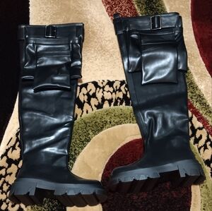 Azalea Wang Thigh High Black Punk Utillity Flatform Boots with Pockets Size 7.5