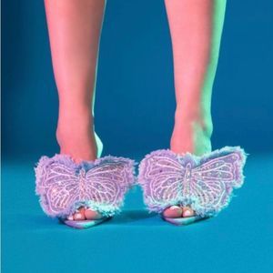 The AZALEA WANG Embellished Butterfly Stiletto Sandal In Denim is made from a washed denim upper and features a pointed peep toe silhouette, a wide toe band with an iridescent rhinestone-embellished fringe hem butterfly detail, a cushioned faux leather insole, a slim stiletto heel, and a slip-on fit.