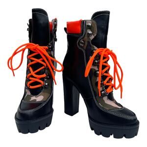 Azalea Wang Camouflage Black Lace Up Block Heeled Platform Boots Size 8 New