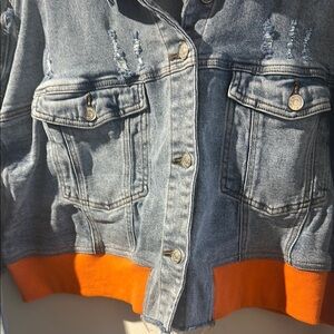 Stylish denim cropped jacket featuring a vibrant orange trim. Perfect for adding a pop of color to your outfit.