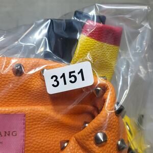 Design: Faux leather moto biker jacket with orange studded lapels, asymmetrical front zip, belted waist, and zip cuffs