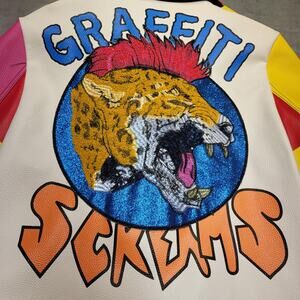 Back graphic: Large sequin and embroidered patch reading "GRAFFITI SCREAMS" with roaring big cat motif (mohawk detail) on a glittered blue circle