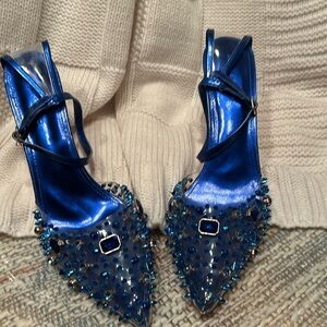 This pointy-toe sandal raised on a stiletto heel is highlighted by a collection of studs and colorful rhinestones. Size 11 runs a little big . Brand new in box