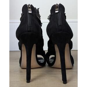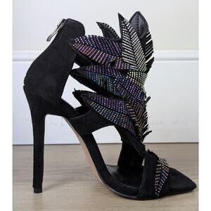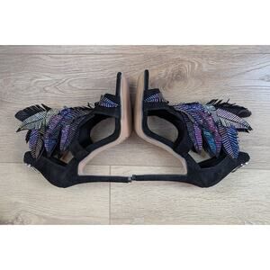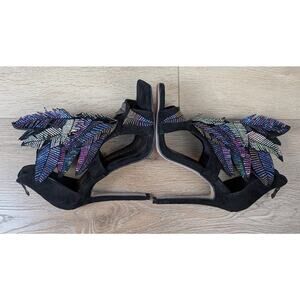 Azalea Wang size 6 black high heel ankle bootie sandals with uppers featuring layered feather like panels covered in iridescent crystals that shift purple, green, and gold for a bold statement look.