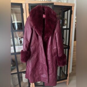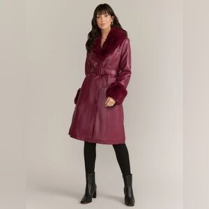 Azalea Wang Marbolo trench coat faux fur PU buttons shawl collar cuffs burgundy