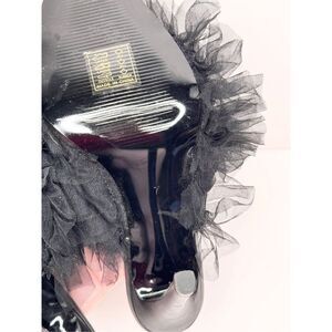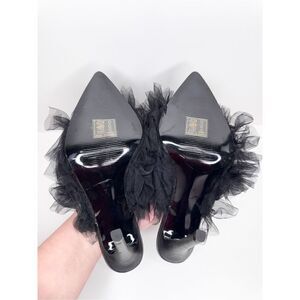 Because you came for the drama. These heels have a vegan leather construction, voluminous layered woven vamps, and pointed toes