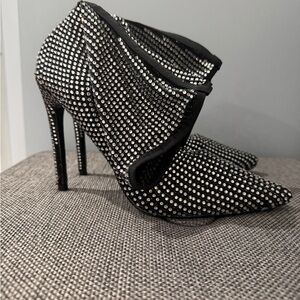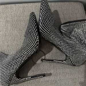 The AZALEA WANG Krispy Silver Rhinestone Embellished Sock Bootie is a fierce, statement shoe that features a stretchy mesh sock upper with fabulous rhinestone embellishments, a mid-calf height shaft with an elastic band to help stay nice and secure, a faux leather structured back seam accent, a slim stiletto heel, a pointed toe silhouette, and an effortless pull-on fit.