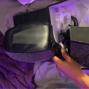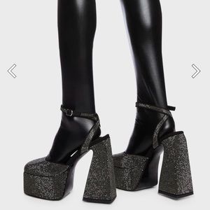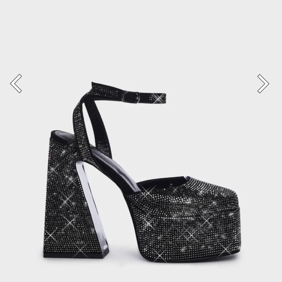 AZALEA WANG Nessa Sparkle Heels cuz wow the crowd. These heels have a black rhinestone construction, platform soles, block heels, and adjustable ankle buckle closures. True to size.