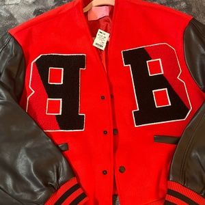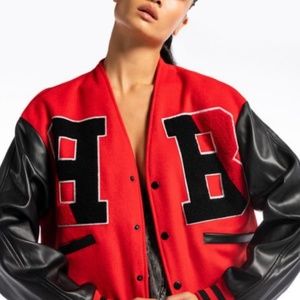 The AZALEA WANG Rider Of The Night Off Shoulder Varsity Jacket features a felted knit base, faux leather long sleeves, button front closure, collarless design, and textured varsity patches at the chest. Complete with slit front pockets, a satin inner lining, ribbed knit elastic striped hems, and a snap button up front closure. This versatile piece can be worn on or off the shoulders.