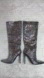 Sparkly boot with faux suede upper. Black boot embellished with rhinestones and gemstones. Pointed toe and stiletto heel. No zipper so you pull them on and off. The pointed toe makes them a little narrow fitting up front.