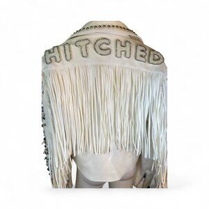 This Azalea Wang The Karl Leather Hitched Fringe White Moto Jacket in Size XL is a stylish and versatile outerwear option, perfect for a Bride for a Wedding or Honeymoon Made of high-quality leather with a polyester lining, this short-length jacket features long sleeves, a full zip closure, and various accents such as fringe, studs, beads, and rhinestones. With a regular fit and a limited edition design, this motorcycle jacket is suitable for all seasons, making it a fashionable choice for women looking to add a touch of edginess to their wardrobe.