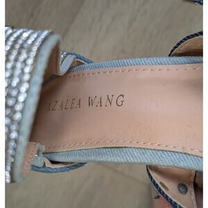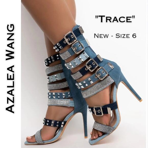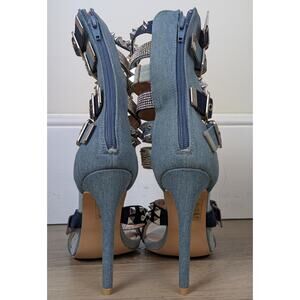 Azalea Wang Trace Heels 6 Denim Strappy Mid Calf Silver Studded Rhinestone NEW